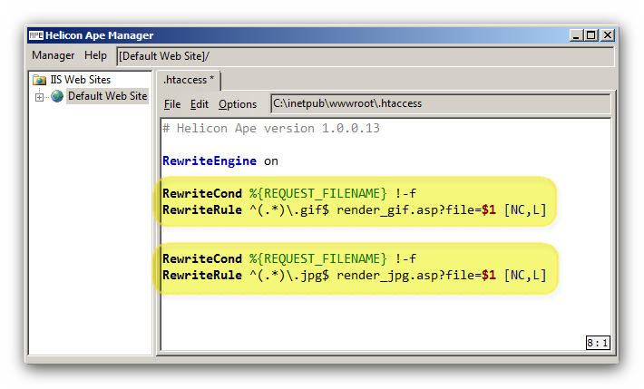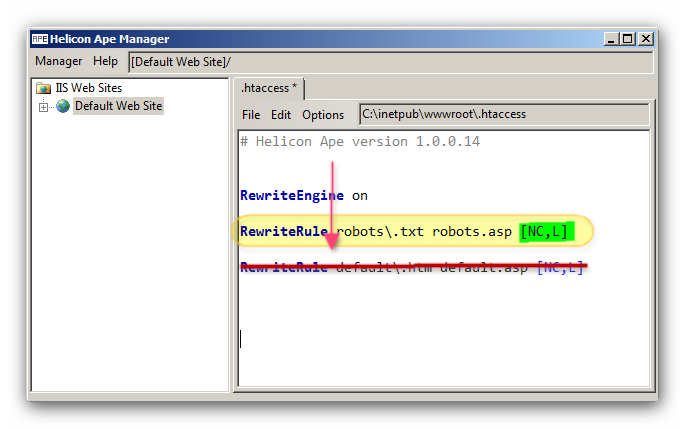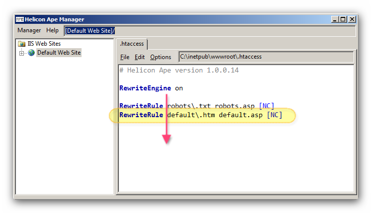 To understand the logic of config processing let’s make it a little more complicated and add the rule rewriting default.htm with default.asp to the end of .htaccess. How will this config be processed?