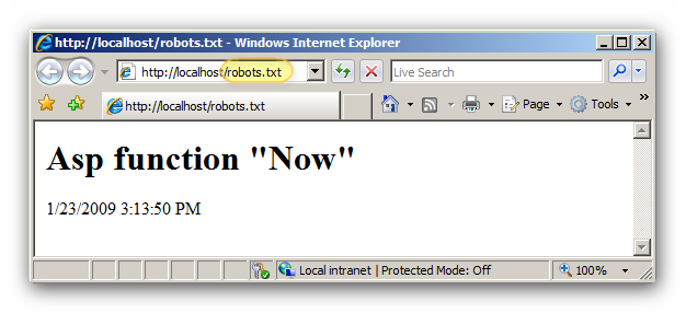 This rule replaces requested robots.txt (this file may not even exist on the server) with real dynamic robots.asp file. [NC] flag makes strings comparison case-insensitive. Clients requesting robots.txt have no idea of what’s happening on server, i.e. they don’t know that instead of static robots.txt they will get dynamically generated response (e.g. as on the picture below).