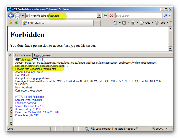 The following picture illustrates the result of the above rule. As you can see, for request /test.jpg referrer did not start with http://www.example.com and the result was “403 – Forbidden”.