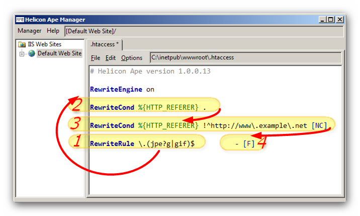 - Second RewriteCond checks if Referer value starts with http://www.example.net. If it doesn’t, control goes back to RewriteRule, if it does, processing terminates and user gets requested resource.