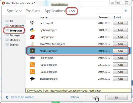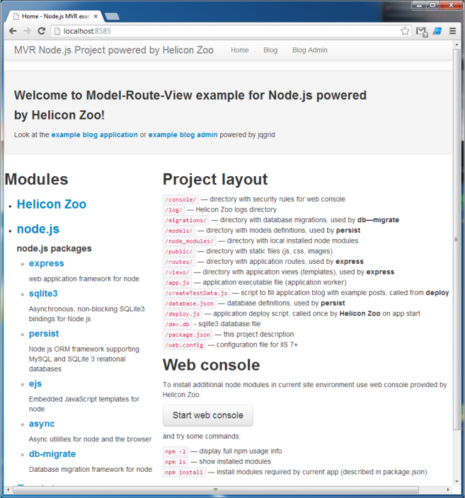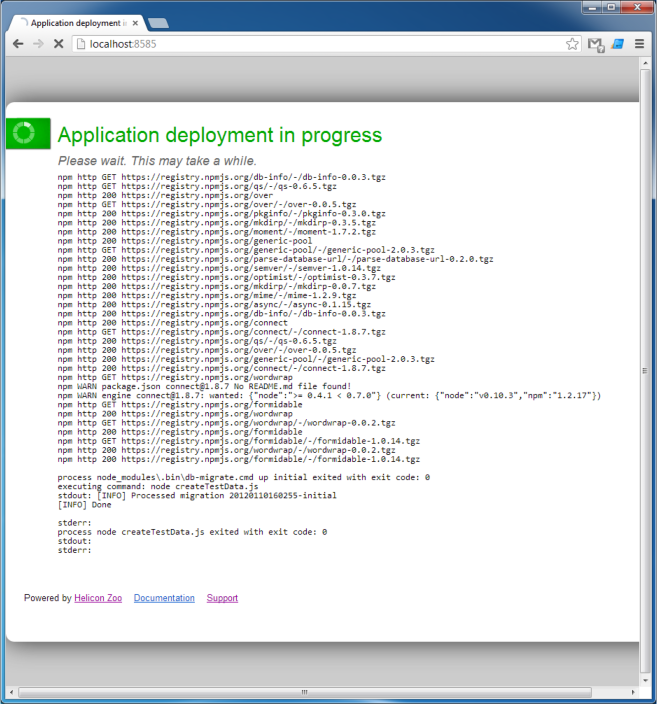 After project installation Application deployment will start, installing all required components into the web site directory. This will create sample Node.js Model-View-Route project which you can use as a starting point for your projet or simply owerwrite it's files if you already have Node.js application. Please don't owerwrite web.config file as all Zoo configurations are in this file.