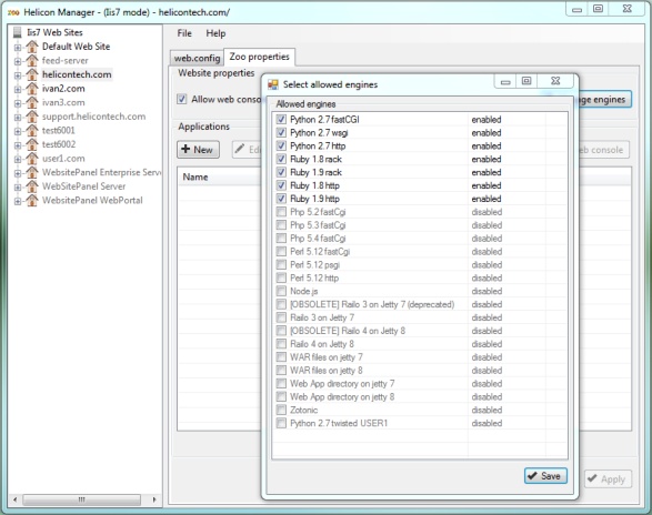 Switchboards allow enabling or disabling individual web engines for selected locations. These are useful for web hosting administrators who need to restrict user access for particular engines or other Helicon Zoo features. Switchboards – are collections of web applications engines and Helicon Zoo features that can be set on or off in different IIS contexts using applicationHost.config file. Normally switchboards are written inside <heliconZooServer> tag of applicationHost.config. Please consider following examples of switchboard usage:
